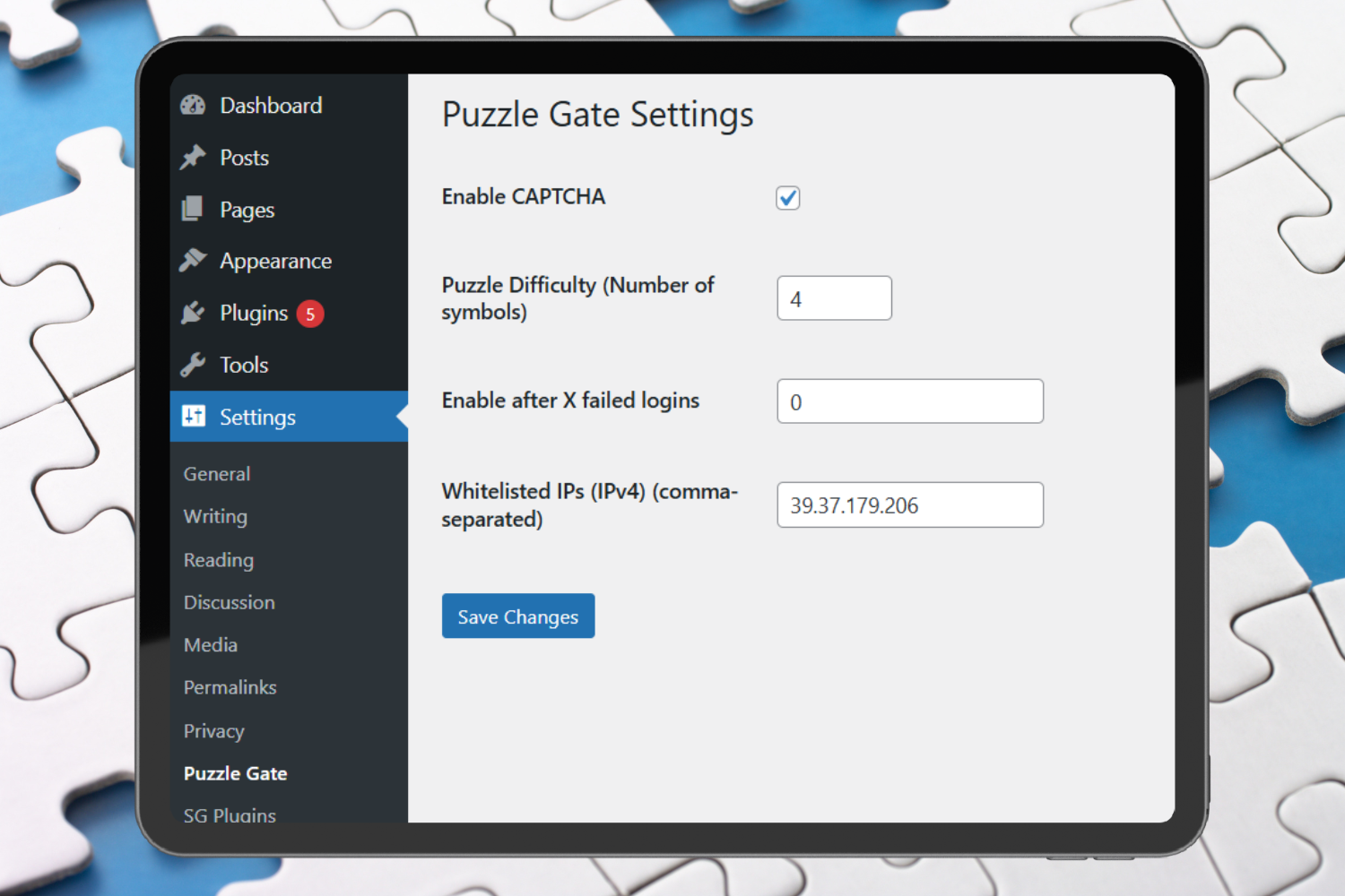 Puzzle Gate includes a settings page where administrators can: