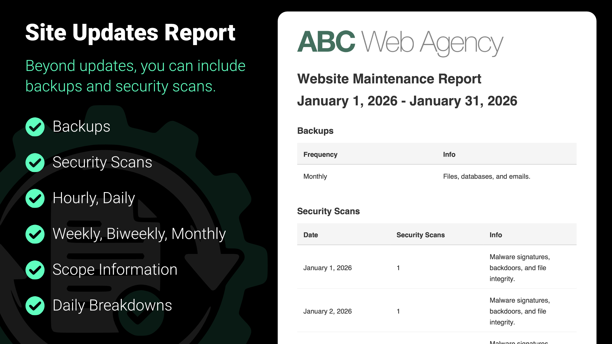 Beyond updates, you can also report on backups and security scans, helping clients understand the full scope of the maintenance work you provide.